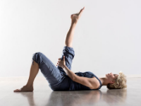 Still on the floor, put the band around your right foot and hold the other end in your right hand. Now do gentle, large circles with your right leg while keeping your left leg straight and on the ground. Do about 10 circles and then switch sides.