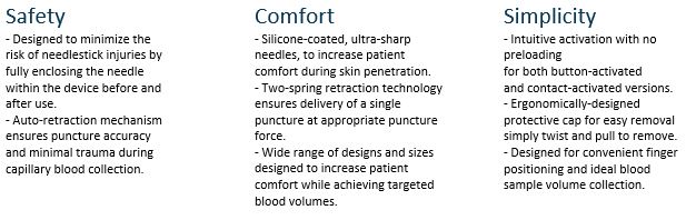 Our safety lancets have a strong legacy of quality and the following key product benefits:
