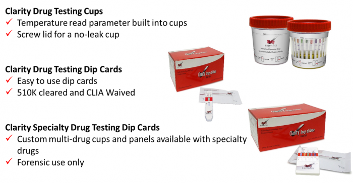 The Clarity Drugs of Abuse (DOA) line of tests detect elevated levels of specific drug metabolites in urine in as fast as 5 minutes. These tests are offered in a cup or dip card.